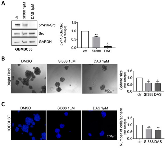 Firstly, we observed a significant reduction in phosphorylation of Src on Tyr416 upon a 1 µM SI388 treatment in this system; although, the inhibitory effect of SI388 is weaker compared to a 1 µM DAS treatment (Figure 4A). We then demonstrated that both treatments significantly decreased the growth of spheres, resulting in an overall reduced diameter of the spheres compared to the control condition (Figure 4B) and a reduced average number of cells per sphere (Figure 4C).
