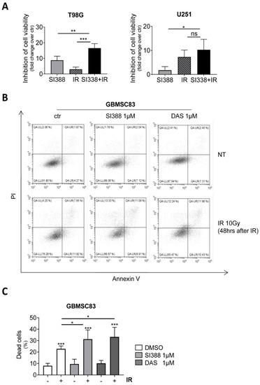 GBMSC83 cells were pretreated with 1 µM SI388 or 1 µM DAS, or DMSO as a control, for 24 h and then irradiated (10 Gy). After 48 h from IR, cytofluorimetric analysis of AnnexinV-PI staining was performed. Interestingly, SI388, as well as dasatinib, sensitized cells to IR and significantly increased the percentage of cell death compared to the control samples (Figure 5, panels B and C).