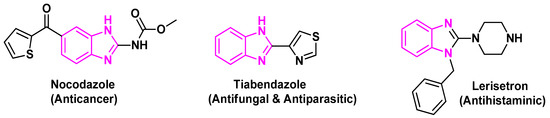 Benzimidazole or 1H-1, 3-benzodiazole-based heterocycles are structurally much like and can evidently take the place of nucleotides, i.e., the adenine base of the DNA. This is regarded in addition to a factor of vitamin B. This feature has been substantially utilized in drug synthesis and medicinal chemistry, showing a huge variety of organic and scientific applications. Benzimidazole is also named 3-azaindole, benzimiinazole, benzoglyoxine. Benzimidazole is a vital modified structure that presents an extensive number of natural and pharmacologically active molecules. Magnetic nanoparticles (MNPs) have emerged as a new category of catalysts. This is referred to as ultrafine size and high surface area. Oxidation is a vital process in cell functionality and human life; imbalance in this biochemical process produces high amounts of free radicals like oxygen and nitrogen [1,2,3]. Oxidative stress of these free radicals leads to the damaging of proteins, DNA and other vital compounds in the body, which can cause chronic illness such as cancer, autoimmune disorders, cardiovascular diseases, diabetes, neurodegenerative diseases and aging [4,5,6]. Therefore, the needs of novel antioxidants have been the subject of intensive research. Heterocylic aromatic compounds with nitrogen atoms are considered as important pharmacophores owing to their versatile pharmacological activities [7] as anti-cancer [8,9], anti-oxidant [10], and anti-microbial [11]. Benzimidazoles are one of the most privileged heterocyclic substructures with wide biological activity, particularly as antioxidants [12,13]. The benzimidazole scaffold is found in many commercial drugs such as Nocodazole (anticancer), Tiabendazole (antifungal and antiparasitic), (Figure 1) [14,15]. The unique aspects of the benzimidazole core structure empower its ability of free-radical scavenging. Hence, the development of a nano-catalyzed environmentally benign protocol for the synthesis of benzimidazole derivatives is widely studied. Nano catalysts improve the yields and reduce the time of the reactions, in addition to their potential to be recycled many times [16,17]. In this regard, the high catalytic reactivity of ZnO nanoparticles and their environmental advantages make it an effective catalyst in organic reactions [18]. As a continuation of our work, some benzimidazoles have been synthesized using ZnO-NPs for their antioxidant examination and DFT studies.