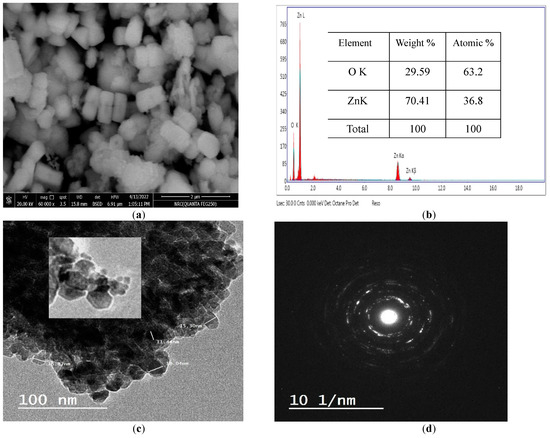 The morphological study revealed that the obtained ZnO-NPs seem to have uniform size in the form of arbitrarily distributed nanorods with a hexagonal (wurtzite) morphology. This complements the planes formed by its hexagonal structure as identified by XRD pattern. Particles had a plane surface in the nano size range [24,25] as revealed in Figure 3a. The remark of some larger nanoparticles in the SEM image was credited to the agglomeration of particles [26]. In addition, the rodlike structure is the best nanostructure compared to others; as a result of their one-dimensional nanostructures [27]. The EDX spectrum established the chemical composition of the ZnO-NPs. Figure 3b demonstrated the presence of only Zn and O elements; thus showing the purity of the prepared ZnO. No impurity was evident within the detection limit of the EDX. Therefore, it may be stated that the EDX proved that the synthesis process used was able to produce pure ZnO nanoparticles within its detection limit. TEM images presented in Figure 3c settled the hexagonal structure of the prepared ZnO nanoparticles as decided by the XRD [28]. The TEM picture Figure 3c together with the selected area electron diffraction (SAED) pattern seen in Figure 3d exhibited diagonally arranged concentric circles distinct with bright spots. The diffraction rings confirmed that the prepared ZnO was highly crystalline with the preferential orientation of nanocrystals [29,30]. As stated by Khan et al., the concentric rings may be acknowledged as the diffraction from the (100), (101), (102), (110), (103) and (112) plane of the polycrystalline structure (wurtzite) of the hexagonal crystal coordination [31].