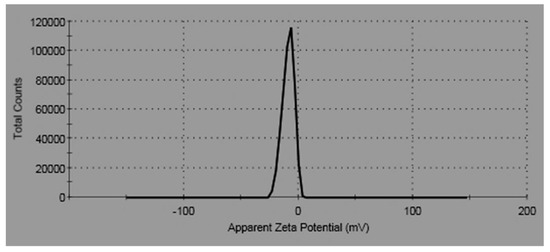 The zeta potential (ξ) was used to recognize the surface charge of the particle, which performed as a sign of their colloidal stability. Nanoparticles with high positive or negative zeta potential display dispersion stability; as a result, they do not agglomerate on storage. The zeta potential of ZnO-NPs was found to be of negative value [−14.4 (mV)] as elucidated in Figure 4. The negative value is probably resultant to the samples’ negative charges. The negative zeta potential value designates that the dispersed ZnO NPs were crowned by negatively charged groups, which demonstrates their stability.