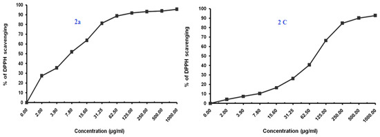 The antioxidant activity was performed using the DPPH radical scavenging method where ascorbic acid was used as a positive control for comparison [32]. The results of the antioxidant activity of the compounds 2a, 2c, 2f, 3, 4 and 5 are shown in Table 2. The activity was assessed by measuring its electron-donating ability to DPPH, which is indicated by changes in absorbance of the solution of different concentrations at 515 nm. The DPPH radical scavenging activity of the compounds increased with an increase in concentration; the result of the radical scavenging was expressed in terms of half-inhibition concentration (IC50), which denotes the concentration required to scavenge 50% of DPPH radicals.
