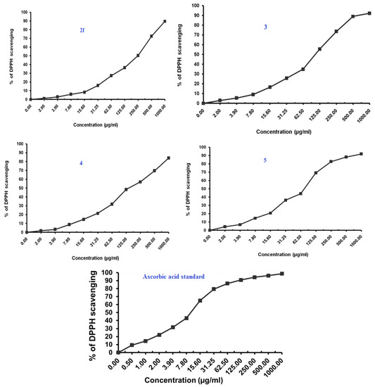 The antioxidant activity was performed using the DPPH radical scavenging method wherein ascorbic acid was used as a positive control for comparison [32]. The results of the antioxidant activity of the compounds 2a, 2c, 2f, 3, 4 and 5 are shown in Table 2 and Figure 5.