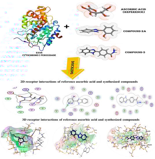 3D and 2D snapshots show the interaction of c peroxidase enzyme PDB: 2X08 with ascorbic acid and compounds (2a and 5).