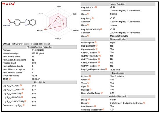 Early on in the drug development process, it is crucial to analyze the pharmacokinetic features of candidate drugs. Lipinski and his team claim that drug-like 2a and 5 must adhere to the rule of five (RO5), which is that they must have a molecular weight (MW) of 500 Da, 5 hydrogen bond donors (HBDs), and 10 hydrogen bond acceptors (HBAs). These requirements are depicted in Figure 7 and Figure 8, respectively [33].