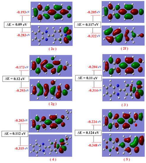 Molecular orbital surfaces and energy levels of compounds (2e–2g) and (3–5) by using DFT calculations.