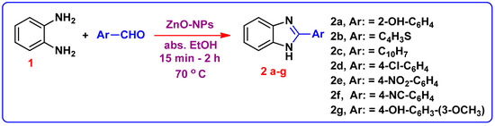 Benzaldehyde derivatives (10 mmol) and o-phenylenediamine (1) (10 mmol) were dissolved in absolute ethanol (50 mL) in the presence of (0.02 mol%) ZnO (nano particles). This mixture was stirred at 70 °C for 15 min–2 h. The product was washed repeatedly with an ethanol–water (1:1) mixture and then recrystallized from ethanol.