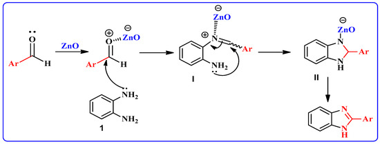 A possible mechanism for the formation of products in the presence of the nano-ZnO catalyst is shown in Scheme 2. At first, the aromatic aldehyde is activated by nano-ZnO. Intermediate I results by nucleophilic attack of o-phenylenediamine 1 to aromatic aldehyde. Subsequently, coordination of nitrogen to nano-ZnO facilitates intramolecular cyclization of intermediate I and the formation of intermediate II. Deprotonation of intermediate II results in the target product.