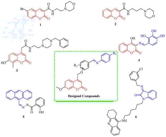 Alzheimer’s disease (AD) is the main cause of dementia and one of the most prevalent neurodegenerative diseases that impact people around the world. It is characterized by progressive memory loss, severe behavioral abnormalities, and cognitive impairments [1]. By 2050, the number of AD patients will have tripled from the present level of more than 50 million worldwide [2]. The cholinergic hypothesis is one of the most significant hypotheses, despite the fact that the etiology of AD has not yet been fully explained. In the brains of AD patients, it was found that the level of the neuromodulator acetylcholine (ACh) was abnormal. Studies have shown that acetylcholine levels rise when acetylcholinesterase (AChE) is inhibited, thereby enhancing memory and cognitive function in patients [3]. Therefore, a major treatment strategy for AD involves inhibiting the acetylcholinesterase (AChE) enzyme, which catalyzes the hydrolysis of ACh neurotransmitters. Currently, drugs such as donepezil, rivastigmine, and galantamine, which belong to the class of acetylcholinesterase inhibitors (AChEIs), are approved and administered as therapeutic options for the management of AD [4]. However, while these medications can provide temporary improvements in memory and cognitive function, they are unable to prevent or reverse the progression of the disease. Given the limitations of current treatments and the urgent need to address both symptomatic relief and disease progression, researchers are continually seeking and developing potential agents that can effectively treat AD and potentially modify its course.Heterocyclic-based compounds have been reported as active inhibitors against the acetylcholinesterase enzyme (AChE). Medicinal chemists have developed and used a variety of coumarin cores to design novel treatments with a wide spectrum of pharmacological properties [4]. Mohammadi-Khanaposhtani et al. have investigated the inhibition of AChE with a series of coumarin-3-carboxamide-N-morpholine derivatives. The obtained IC50 values ranged in micromolar levels (6.21–26.4 µM). Compounds 1 and 2 were found to be the most active among the series [5]. Kara et al. reported the synthesis and AChE inhibition activity of a series of coumarin-based compounds. Among the series, derivative 3, with an IC50 value of 0.04 µM, displayed higher activity [6]. On the other hand, Schiff bases represent an important group of organic compounds with various biological activities [7,8,9,10,11]. The study of novel biologically significant Schiff bases has been drawing the attention of chemists and pharmacists [12,13,14,15]. Wang et al. have designed and synthesized a series of Schiff bases containing coumarin cores. The synthesized compounds were assessed for their anti-Alzheimer activity. The obtained results showed that derivative 4 showed higher inhibitory activities with IC50 values of 0.673 and 0.711 µM for human monoamine oxidasehMAO-A and hMAO-B, respectively [16]. Compound 5 showed promising inhibitory activity against AChE with an IC50 value of 4.12 µM [17]. In 2019, 16 hybrids of acrine-isatin Schiff bases were designed and synthesized by Riazimontazer and co-workers. The designed compounds were tested as potential anti-Alzheimer agents. Compound 6, with an IC50 value of 0.42 nM, was the most potent (IC50 = 38.72 nM). Interestingly, chloro-substituent compounds displayed stronger inhibitory activity than those with nitro and methoxy substituents [18]. Figure 1 shows that some coumarin and Schiff base-containing compounds were reported as AChE inhibitors.