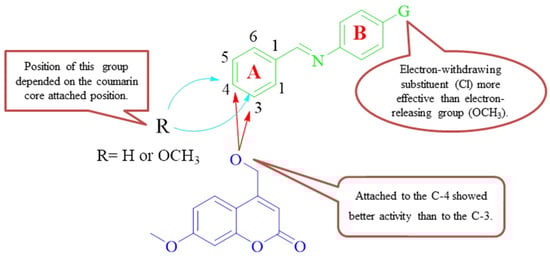 Furthermore, the introduction of a methoxy group on the ring-B, as in compounds 13b, 13f, 13g, and 13h, decreased anti-AChE activity, whereas the inhibitory activity against the enzyme was increased by the incorporation of a chloro group, as in compounds 13c, 13d, 13i and 13j. That is worth mentioning; the connection of the imine moiety to the coumarin core at 4-O was preferred. The structure-activity relationship (SAR) study of hybrids (13a-j) was summarized as follows (Figure 2): (1) The anti-AChE activity of the target compounds, which substituent group on imine ring-B was the electron-withdrawing group was better than that of the electron-donating group (-Cl > H > OCH3). (2) The bioassay outcome pointed out that the presence of chloro on C-4 of ring-B together with methoxy substituents on phenyl ring-A at the third position of the imine scaffold enhanced the AChE inhibition. (3) The coumarin core attached to the imine moiety via the O atom at C-4 was more active than those attached at C-3.