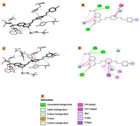 The proposed binding modes of synthesized hybrids (13c and 13d) docked in the active site of acetylcholinesterase (4EY7) protein; (A) 3D ligand interactions of 13c, with the target receptor, (B) 2D ligand interactions of 13c, with the target receptor, (C) 3D ligand interactions of 13d, with the target receptor, (D) 2D ligand interactions of 13d, with the target receptor, and (E) Representative keys for the type of interactions.