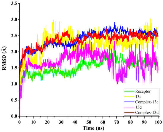 The root-mean-square deviation (RMSD) of the solvated receptor backbone, hybrids (13c and 13d), and the receptor.