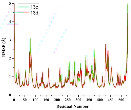 The root-mean-square fluctuation (RMSF) of solvated receptor backbone and hybrids (13c and 13d) with a receptor.