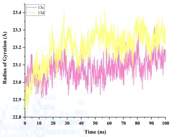 Radius of gyration (Rg) of receptor-ligands (13c and 13d).
