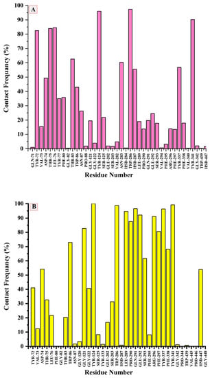 Contact frequency percentage analysis for receptor-hybrids; (A) 13c, and (B) 13d.