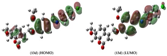 Frontier molecular orbitals of the compounds (13c and 13d) utilizing wb97xd/6-311++g(d,p) level of calculation.