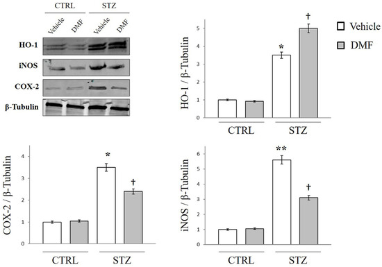 To study the effect of DMF on oxidative stress and the inflammatory process in DR, we assessed the expression profile of HO-1, COX-2, and iNOS via Western blot analysis. As shown in Figure 1, STZ-injected rats displayed a significant retinal upregulation of HO-1, COX-2, and iNOS when compared with the retina of non-diabetic rats (* p < 0.05 and ** p < 0.01 vs. CTRL). A single intraperitoneal dose of DMF in hyperglycemic rats significantly increased the retinal expression of HO-1 († p < 0.01 vs. STZ + Vehicle), confirming the role of DMF as an HO-1 inducer exerting antioxidant effects. Moreover, the treatment with DMF strongly reduced the expression of the inflammatory factors COX-2 and iNOS, when compared with diabetic rats († p < 0.05 vs. STZ + Vehicle), confirming the anti-inflammatory role played by DMF.