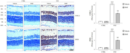 Localization of COX-2 and iNOS in the retina of the control group (CTRL), and diabetic rats (STZ) intraperitonially injected with Vehicle or DMF. Representative immunohistochemical staining of COX-2 and iNOS in the retina of control animals or diabetic rats (STZ) injected with Vehicle or after DMF treatment. Retinal layers are indicated as follows: ganglion cell layer (GCL), inner plexiform layer (IPL), inner nuclear layer (INL), outer plexiform (OPL), outer nuclear layers (ONL), photoreceptors layer (PR) and retinal pigmented epithelium (RPE). The bar graphs show the results of densitometric analyses. Vehicle (white bars) and DMF (gray bars). Results are representative of at least three independent experiments (n = 4). Data are expressed as Mean ± SEM *** p < 0.001 vs. CTRL, †† p < 0.01 vs. STZ, as determined by One-Way ANOVA followed by Tukey post hoc test.