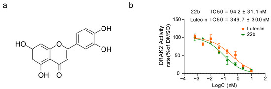 Structure of luteolin and molecular activity. (a) Chemical structure of luteolin (C15H10O6, Mw: 286.23). (b) Inhibitory activity of luteolin on Drak2 was measured by ADP-Glo kinase assay, n = 4.