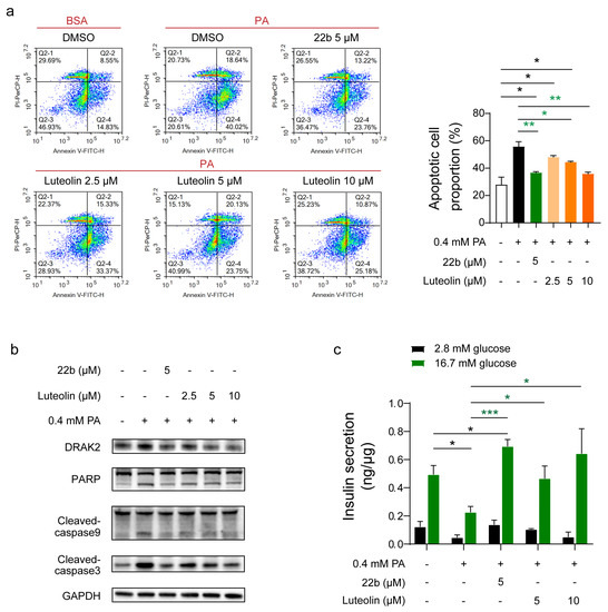 Effects of luteolin on inhibition of apoptosis and promotion of GSIS. (a) Representative FACS analysis and quantification of apoptotic rate with PA induced in response to treatments in INS-1E cells. Cell apoptosis was assessed by flow cytometry using Annexin V/PI staining in INS-1E cells, n = 3. (b) Apoptosis marker proteins PARP, Cleaved-caspase 3 and Cleaved-caspase 9 levels in INS-1E; 22b is a classical Drak2 inhibitor and thus serves as a positive control. (c) GSIS analysis on primary islet, n = 3. All values are presented as mean ± SEM of at least three independent experiments; * p < 0.05, ** p < 0.01, *** p < 0.001.