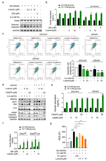 Effects of luteolin on apoptosis in INS-1E cells and GSIS function in primary islets. (a) Apoptosis marker proteins PARP and Cleaved-caspase 3 levels in INS-1E. (b) GSIS analysis on INS-1E cells after Drak2 overexpression, n = 3, * p < 0.05, vs DMSO group. # p < 0.05, vs OE-Drak2 DMSO group. (c) Representative FACS analysis and quantification of apoptotic rate after siDrak2 in INS-1E cells, n = 3. ** p < 0.001, vs siControl DMSO group, # p < 0.05, ## p < 0.01, ### p < 0.001, vs. siControl PA group. (d) Western blot analysis of PRAP and Cleaved-caspase 3 protein levels in INS-1E cells after siDrak2. (e) GSIS analysis in INS-1E cells after siDrak2, n = 3. *** p < 0.001, vs DMSO group, ### p < 0.05, vs siDrak2 DMSO group. (f) GSIS analysis on primary islet, which isolated from Drak2f/f mice and Drak2f/f: Cre mice, were treated by luteolin and 22b for 90 min, n = 3, * p < 0.05, vs Drak2f/f mice DMSO group. (g) ROS levels after overexpressing DRAK2 and treatment of Vitamin C (VC) or luteolin in PA-induced INS-1E cells for 24 h, n = 5. All values are presented as mean ± SEM of at least two independent experiments * p < 0.05, *** p < 0.001.
