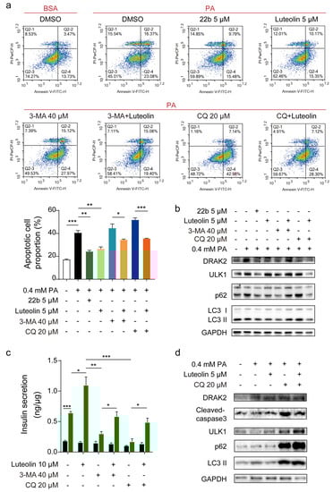 Therapeutic effects of luteolin reduced by autophagy inhibitors. (a) Representative FACS analysis and quantification of apoptotic rate with PA induced in response to various treatments in INS-1E cells. CQ and 3-MA are inhibitors of autophagy and thus serve as negative controls; 22b is an inhibitor of Drak2 and thus serves as a positive control, n = 3. (b) Western blot analysis of the autophagy marker proteins ULK1, LC3 II and p62 levels in INS-1E cells. (c) GSIS on primary islets after treatment, measured by HTRF assay, n = 3. (d) Western blot analysis of apoptosis marker protein on primary islets. All values are presented as mean ± SEM of at least three independent experiments. * p < 0.05, ** p < 0.01, *** p < 0.001.