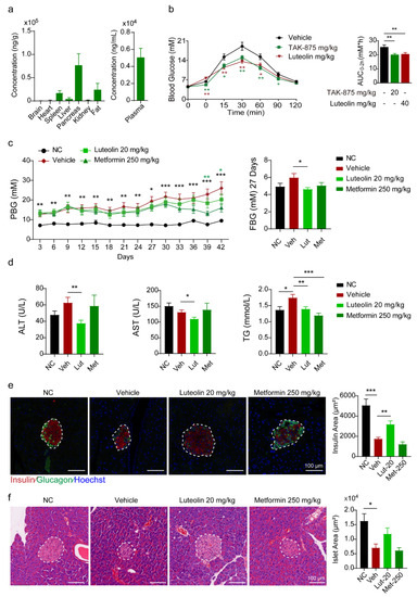 Therapeutic effects of luteolin on mice. (a) Tissue distribution of luteolin by i.p. in ICR mice, n = 4. (b) GTT analysis and quantification on vehicle and compound treatment groups. Blood glucose was determined at the indicated time points after i.p. injection of 2 g/kg glucose (n = 10 per group) and AUC0-120min. (c) Postprandial blood glucose (PBG) levels in different treatment groups, and fasting blood glucose (FBG) level at 27 days in different treatment groups, n = 8–13. (d) Differences in ALT, AST, TG in plasma between different treatment groups, n = 8–13. (e) Immunofluorescence of glucagon (green) and insulin (red) in pancreatic islets of mice, n = 20. (f) Area of islet assessed by hematoxylin and eosin (H&E) staining, n = 20. All values are presented as mean ± SEM of at least three independent experiments; * p < 0.05, ** p < 0.01, *** p < 0.001.