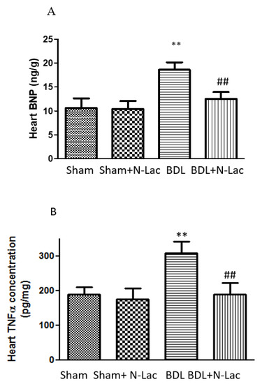 Heart BNP and TNFα levels. (A) BNP expression is significantly increased in BDL rats. N-Lac significantly decreased BNP concentration. (n = 6 in each group, ** p < 0.05 compared with sham; ## p < 0.05 compared with BDL). (B) TNFα expression is significantly increased in BDL rats; N-Lac significantly decreased TNFα concentration. (n = 6 in each group, ** p < 0.05 compared with sham; ## p < 0.05 compared with BDL). BNP: brain natriuretic peptide; TNFα: tumor necrosis factor-alpha; BDL: bile duct ligation. Adapted from reference [20]: Yoon KT et al., Clin Mol Hepatol 2022;28:232–241.
