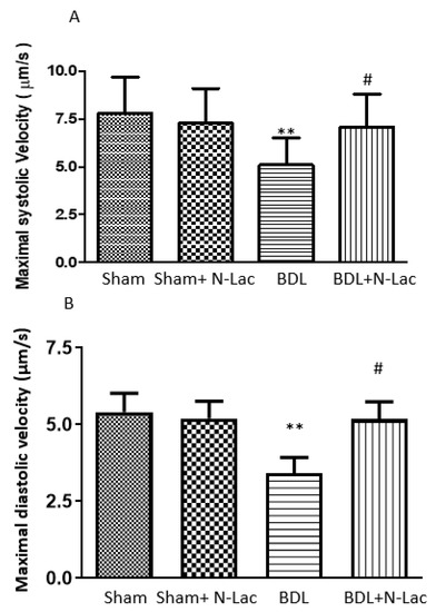 Isolated cardiomyocyte contractility and relaxation. (A) Isoproterenol-stimulated maximal systolic velocity. Systolic velocity was significantly decreased in BDL cirrhotic rats compared to the sham control group (** p < 0.05). Treatment of the BDL cirrhotic cells with N-Lac significantly reversed the reduced systolic contractility in this group (# p < 0.05 compared to the BDL group; n = 6 in each group). (B) Diastolic relaxation velocity under isoproterenol stimulation. Diastolic relaxation velocity was significantly decreased in BDL cirrhotic rat cells compared to the sham-control cells (** p < 0.01). Treatment of the BDL cardiomyocytes with N-Lac significantly reversed the reduced diastolic relaxation velocity in BDL rats (# p < 0.05 compared to the BDL group; n = 6 in each group). Sham: sham-operated; BDL: bile duct ligation; N-Lac: N-acetyllactosamine. Adapted from reference [20]: Yoon KT et al., Clin Mol Hepatol 2022;28:232–241.