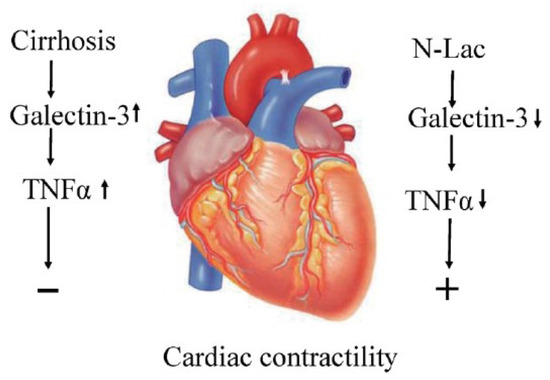Using isoproterenol (ISO)-induced cardiac hypertrophy in rats, Li et al. [33] demonstrated that hypertrophy-related genes, including atrial natriuretic peptide (ANP), brain natriuretic peptide (BNP), and β-myosin heavy chain (β-MHC), and the heart weight/body weight (HT/BT) ratio were increased, which was associated with significantly reduced cardiac function. Modified citrus pectin, a specific inhibitor of galectin-3, decreased the levels of ANP, BNP, and β-MHC, prevented cardiac hypertrophy, and improved cardiac function. These data suggest that modified citrus pectin may be a useful treatment for pathological cardiac hypertrophy. Another inhibitor of galectin-3 is N-Acetyl-D-lactosamine (N-Lac). Using a hypoxia-induced pulmonary arterial hypertension model in rats, Luo et al. [68] found that galectin-3 was significantly upregulated in pulmonary artery adventitia. Galectin-3 stimulated the excessive proliferation and differentiation of pulmonary adventitial fibroblasts and collagen synthesis. These effects of galectin-3 were reversed by N-Lac. As detailed in the previous section, N-Lac significantly improved the systolic and diastolic contractility in cardiomyocytes from cirrhotic rat hearts (Figure 4).