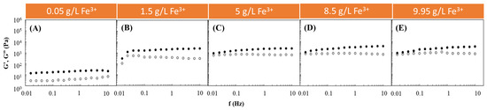 Effect of Fe3+ concentration ((A) 0.05 g/L, (B) 1.5 g/L, (C) 5 g/L, (D) 8.5 g/L and (E) 9.95 g/L) on the storage (G′, solid symbols) and loss (G″, open symbols) moduli of FucoPol HMs prepared using 1wt.% of FucoPol.