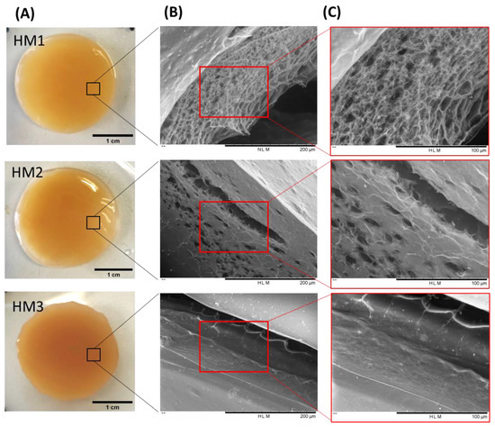 As shown in Figure 3A, the three FucoPol HMs exhibited a similar macroscopic appearance, being translucid and displaying an orange coloration, given by the presence of Fe3+ cations. However, color intensification and lower translucency were observed for the HM3 membranes, which might be related to their higher polymer and Fe3+ contents.