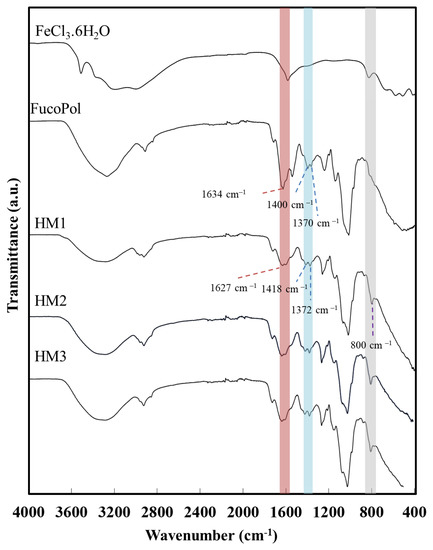 Fourier transform infrared spectroscopy (FTIR) spectra of FeCl3·6H2O, FucoPol, HM1, HM2 and HM3.