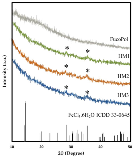 The presence of Fe3+ in the structure of FucoPol HMs was also assessed via XRD. As shown in Figure 5, FucoPol presents a diffractogram typical of an amorphous polysaccharide with no characteristic peaks, which is consistent with diffractograms previously reported for FucoPol and other polysaccharides [48]. On the other hand, the diffraction patterns of the HMs exhibited small peaks at around 28.2° and 35.5° (marked with * in Figure 5), which correspond to the (−311) and (221) planes of iron chloride hydrate (ICDD card 033-0645), whose space group is C2/m. This observation confirms the presence of Fe3+ cations within the structures [49]. The low intensity of the peaks in the FucoPol HMs’ patterns can be ascribed to the low amount of Fe3+ in the structures (Table 1) [49].