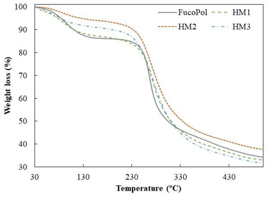 Thermogravimetric curves of FucoPol and HM1, HM2 and HM3 HMs.