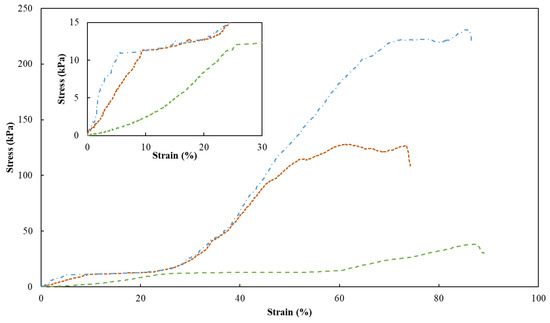 To assess the mechanical properties of the FucoPol HMs, a single compression (90% of the initial height) was applied to evaluate the membranes’ hardness, compressive modulus and toughness (Table 1). Figure 7 shows the compressive stress–strain curves of HM1, HM2 and HM3, which demonstrated a linear elastic deformation under small strains (insert graph in Figure 7), followed by a plateau attributed to the deformation of the porous structure via yielding or bending. After that, the denser structure due to the loss of pores resulted in significant strain hardening [52]. It can be noticed that the mechanical characteristics of HMs were significantly affected by their polymer and Fe3+ contents. Despite the similarities between the stress–strain profiles, HM1 and HM3 presented similar higher rupture strain values (88% and 86%, respectively), compared to that of the HM2 membrane (around 73%) for the same compressive stress value (90%) (Figure 7).