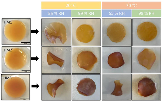 The capacity of the FucoPol HMs to retain water inside their structures is determined by the van der Waals forces and hydrogen bonding established between the hydrogels and water molecules [55,56]. This feature plays an important role in several applications. The effect of temperature and relative humidity (RH) in the water retention behavior of the FucoPol HMs was evaluated by incubating samples under RH values of 55 and 99% at temperatures of 20 and 30 °C. The macroscopic appearance of all the membranes is shown in Figure 8. It can be observed that, at the end of each experiment, the HM1 membranes presented a lighter coloration, whereas the HM2 and HM3 membranes intensified their color, and the membranes became brownish. Moreover, under high RH values (99%), all membranes remained flat regardless of the temperature used. On the other hand, under an RH ≈ 55%, likely due to faster water evaporation, wrinkling of the membranes was observed (Figure 8).