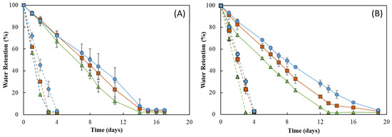 As shown in Figure 9, the RH strongly influenced the water retention ability of the membranes. In fact, under RH ≈ 55%, all membranes lost water sharply, and after 4 days of incubation, they were dry (water retention ~ 2%) (Figure 9, dashed lines). In addition, 19 days were needed to achieve similar values for incubation carried out at RH ≈ 99% (Figure 9, full lines). On the other hand, no significant differences were perceived for the incubation at 20 °C (Figure 9A) or 30 °C, as similar profiles were observed at both temperatures for all membranes (Figure 9B). However, for all membranes, the water loss rate was higher at 30 °C when compared to that obtained at 20 °C for the same RH value (99%). This behavior of a higher water release with an increase in temperature has also been reported for other polysaccharide hydrogels, such as those based on CMC [57] or chitosan [55].