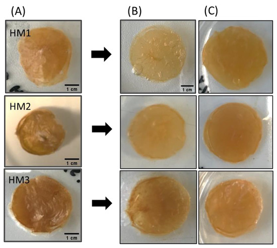 Macroscopic appearance of (A) freeze-dried, (B) water-swollen and (C) NaCl 0.9% swollen HM samples.