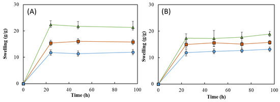 Interestingly, the swelling ratio of the HM1 membranes was higher in deionized water (Figure 11A) than in NaCl 0.9% (Figure 11B). After 96 h, the membranes placed in water achieved a swelling ratio of 21.3 ± 1.7 g/g, whereas lower values were obtained in NaCl 0.9% (18.9 ± 0.7 g/g). The decrease in the swelling ability of NaCl 0.9% can be attributed to a lower osmotic pressure difference among the hydrogels and the medium, causing a decrease in the network volume and a shrinkage of the hydrogel. Analogous results were reported for CGC-based [39] and cellulose nanocrystal hydrogels [61].