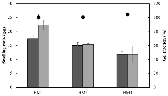 The ionic crosslinking density of HMs was assessed for the gel fraction study (Figure 12). The gel fraction describes the degree of the crosslinking present in the hydrogel polymer matrix, and its value is inversely proportional to the swelling capacity [63]. In fact, the HM3 membranes presented a slightly higher gel fraction (105.3 ± 2.0%) than that of either HM2 or HM1 (101.4 ± 1.9 and 98.3 ± 1.2%, respectively), which is consistent with the higher polymer and Fe3+ contents present in the HM3 membranes (Table 1). Moreover, increasing the crosslinker concentration induced a decrease in the polymer chain relaxation, causing low swelling of the hydrogel [64]. Similar behavior was demonstrated for the Fe3+-xanthan gum hydrogels [15], for which the swelling ratio was lowered from 26.92 to 2.31 g/g when the polymer concentration increased from 0.01 to 0.07 g/mL.