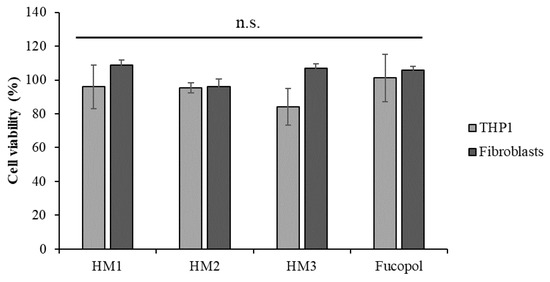 Acute monocytic leukemia cell line, THP1 (light grey bars) and normal dermal fibroblasts (dark grey bars) cell viability (percentage) after 24 h of exposure to HM1, HM2 and HM3 HMs and 500 µg/mL of Fucopol. Bars represent the average ± SD of three independent experiments. n.s.—non-statistically significant.