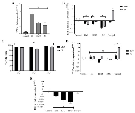 Effect of HMs on TNF-α expression levels in THP1 cells. Inflammation in THP1 cells was stimulated for 2 h via the addition of 7 µg/mL lipopolysaccharides (LPS), and then the HMs or 500 µg/mL of Fucopol were added. In parallel, cells were submitted to the same treatment but without LPS. (A) TNF-α expression after 2 h, 2 h 30 and 5 h in LPS-treated samples calculated with 2−∆∆Ct using the RNA 18S and corresponding LPS untreated samples as reference. (B) TNF-α expression after 2 h 30 and 5 h in LPS-treated samples that were exposed to the HMs and Fucopol for 30 min (2 h 30 samples) and 3 h (5 h samples), calculated with 2−∆∆Ct using the RNA 18S and corresponding LPS control samples as reference. (C) Percentage of reduction in TNF-α expression in HM-treated samples relative to the respective control sample (treated with LPS and collected at the same time point). (D) TNF-α expression after 2 h 30 and 5 h in LPS untreated samples that were exposed to the HMs and Fucopol for 30 min (2 h 30 samples) and 3 h (5 h samples), calculated with 2−∆∆Ct using the RNA 18S and corresponding control samples as reference. (E) TNF-α expression after 2 h in samples that were simultaneously submitted to LPS and to the HMs or Fucopol, calculated with 2−∆∆Ct using the RNA 18S and corresponding LPS untreated samples as reference. Bars are the average ± SEM of three independent experiments. * p-value below 0.05 relative to control; ns—non-statistically significant.