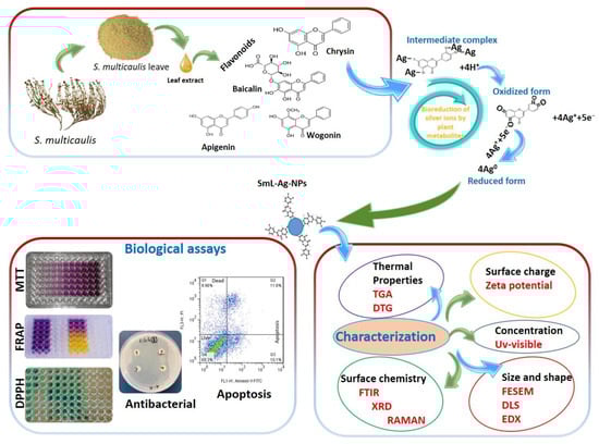 A representative schematic of the green synthesis, characterization, and biological tests of silver nanoparticles using Scutellaria multicaulis leaf extract.