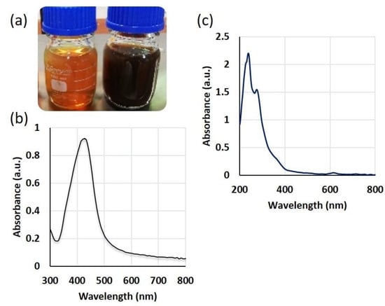 (a) Visual observation of the reduction of silver ions to SmL-Ag-NPs; UV-Visible spectroscopy analysis of (b) SmL-Ag-NPs and (c) plant extract.
