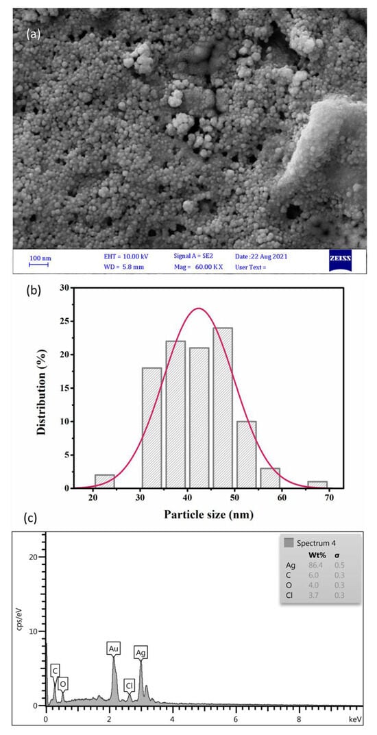 FE-SEM/EDX analysis as an advanced technology was used to visualize the morphological and topographical information on the surface of fabricated SmL-Ag-NPs (Figure 3). FE-SEM images confirmed that SmL-Ag-NPs were mainly spherical and oval and mono-dispersed in the particle size ranging from 31 to 58 nm and an average size of 42.5 nm (Figure 3a). Figure 3b shows the FE-SEM histogram of the particle size distribution of SmL-Ag-NPs, which is plotted by analyzing several frames of the same FE-SEM images. The results agreed with the similar finding reported by Gharari et al. (2022), where the FE-SEM studies show that the average size of Sm-AgNPs synthesized by S. multicaulis stem extract is 60 nm [7]. FE-SEM/EDX microanalysis was used to identify the composition of SmL-Ag-NPs and their relative abundance (Figure 3c). The EDX spectrum of SmL-Ag-NPs represents their pure elemental composition profile. As shown in the EDX spectrum, the most intense absorption peak observed at around 3 keV, which strongly verifies the presence of metallic silver (86.4%) as a major element [7]. Concurrently, the EDX spectrum revealed the presence of 6% of carbon, 4% of oxygen, and 3.7% of chlorine atoms in the formation of SmL-Ag-NPs (Figure 3c). The presence of gold ions in the EDX micrograph is due to the application of gold ions as cover during analysis. The absence of nitrogen ions in the EDX pattern indicates the complete reduction of Ag+ ions to Ag by bioactive plant metabolites [18]. Additionally, the presence of other elements in the EDX pattern confirms the tendency of plant-based phytochemicals in the reduction and stabilizing of silver ions during biosynthesis [4,7,18].