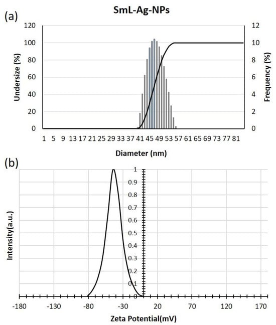 As shown in Figure 4b, SmL-Ag-NPs were negatively charged with a high zeta potential of −42.6 mV, indicating good dispersion stability and increased electrostatic repulsion of SmL-Ag-NPs wrapped with anionic plant biomolecules in the colloidal suspension [7]. The presence of single hydroxyl groups (−OH) belonging to plant-origin phytochemicals trapped on the surfaces of SmL-Ag-NPs and their function as reducing and stabilizing agents is perhaps the leading cause of the anionic state of SmL-Ag-NPs [19]. Since the surface of most cellular membranes is negatively charged, these kinds of nanoparticles is less toxic in comparison to positively charged ones due to the electrostatic repulsion force between AgNPs and cells in the cytotoxicity effect [20].