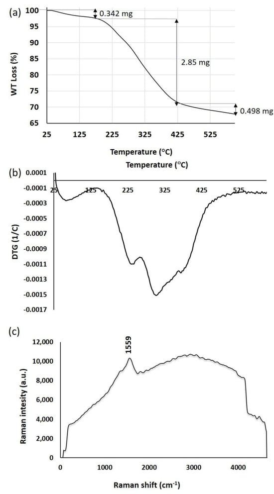 (a) TGA thermogram of SmL-Ag-NPs; (b) DTG curve of SmL-Ag-NPs; (c) Raman spectrum of SmL-Ag-NPs. TGA: Thermogravimetric Analysis; DTG: Derivative Thermogravimetry.