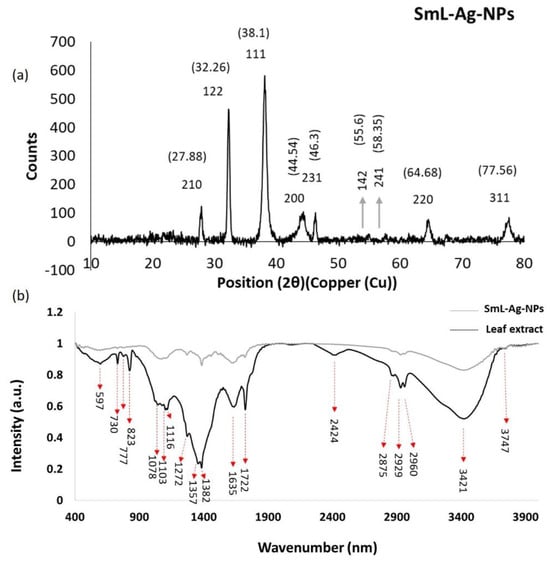 (a) XRD of SmL-Ag-NPs; (b) FTIR spectra in the comparative mode showing Scutellaria multicaulis leaf extract and biosynthesized SmL-Ag-NPs. XRD: X-ray diffraction analysis; FTIR: Fourier-transform infrared spectroscopy.