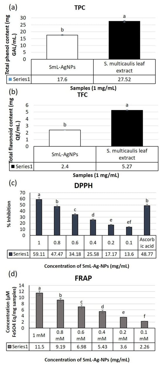 (a) Total phenolic content and (b) total flavonoid content of SmL-Ag-NPs and S. multicaulis leaf extract. Antioxidant activity of SmL-Ag-NPs by (c) DPPH and (d) FRAP assays. Different lower-case letters indicate a significant difference among different concentrations. DPPH: 2,2-Diphenyl-1-picrylhydrazyl; FRAP: Ferric Reducing Antioxidant Power Assay.